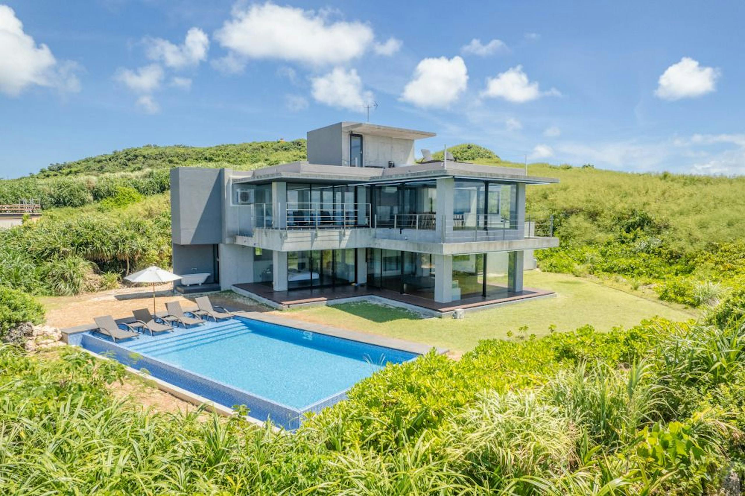 Castello di mare カステロディマーレ 宮古島は、一棟貸切の贅沢な別荘。海にたたずむ城をコンセプトにしたモダンな建築と、壮大なオーシャンビューが魅力です。屋上のテラスやプールサイドには、温水対応のプールやジャグジー、アウトドアバスなどがあり、海と空の一体感を感じられますよ。