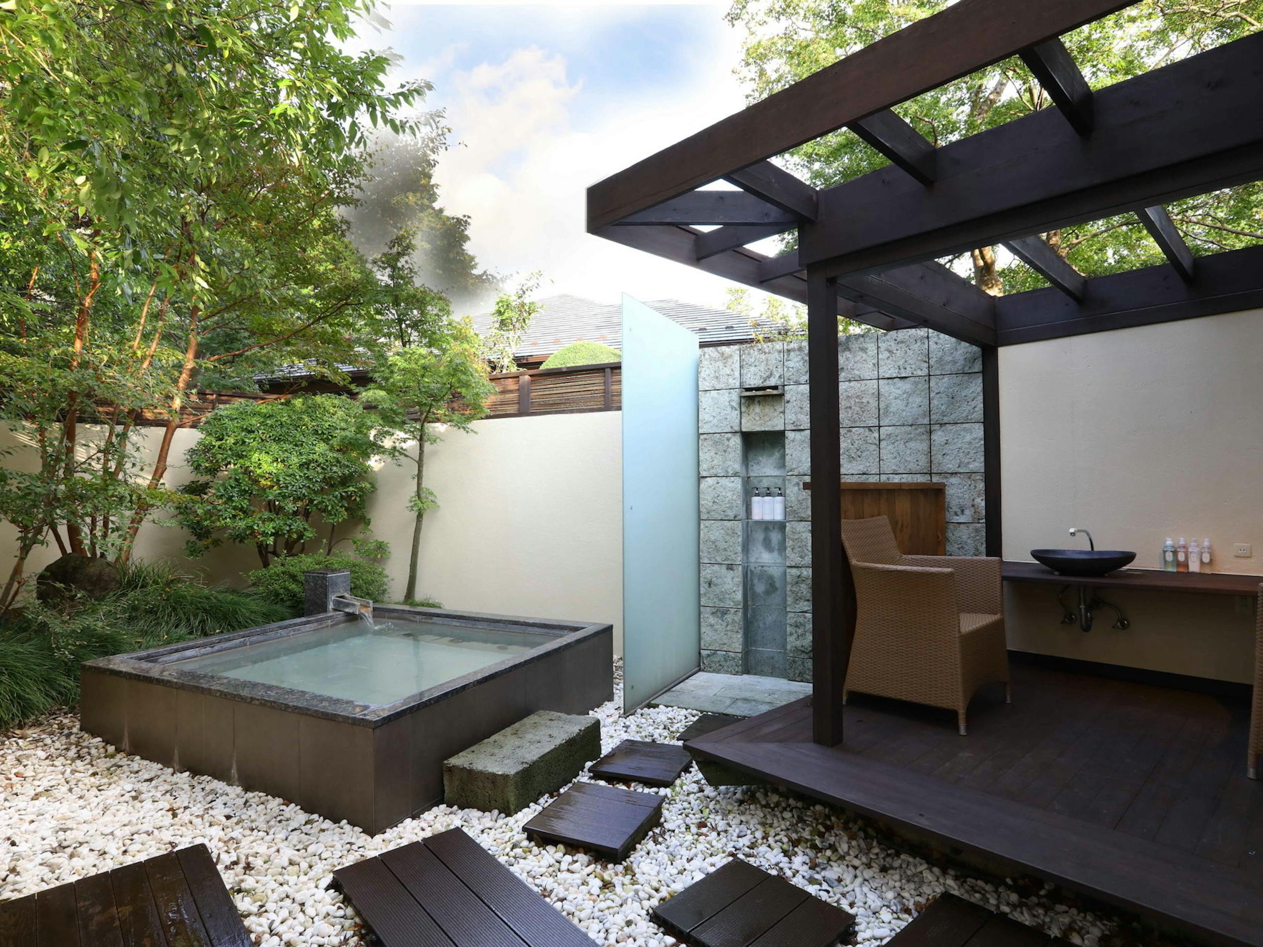 天然温泉の露天風呂を楽しめる客室や、大人っぽく落ち着いた雰囲気が魅力のバー、特別なひと時を過ごせるスパなど、癒しの空間が充実している「金乃竹 塔ノ澤」。