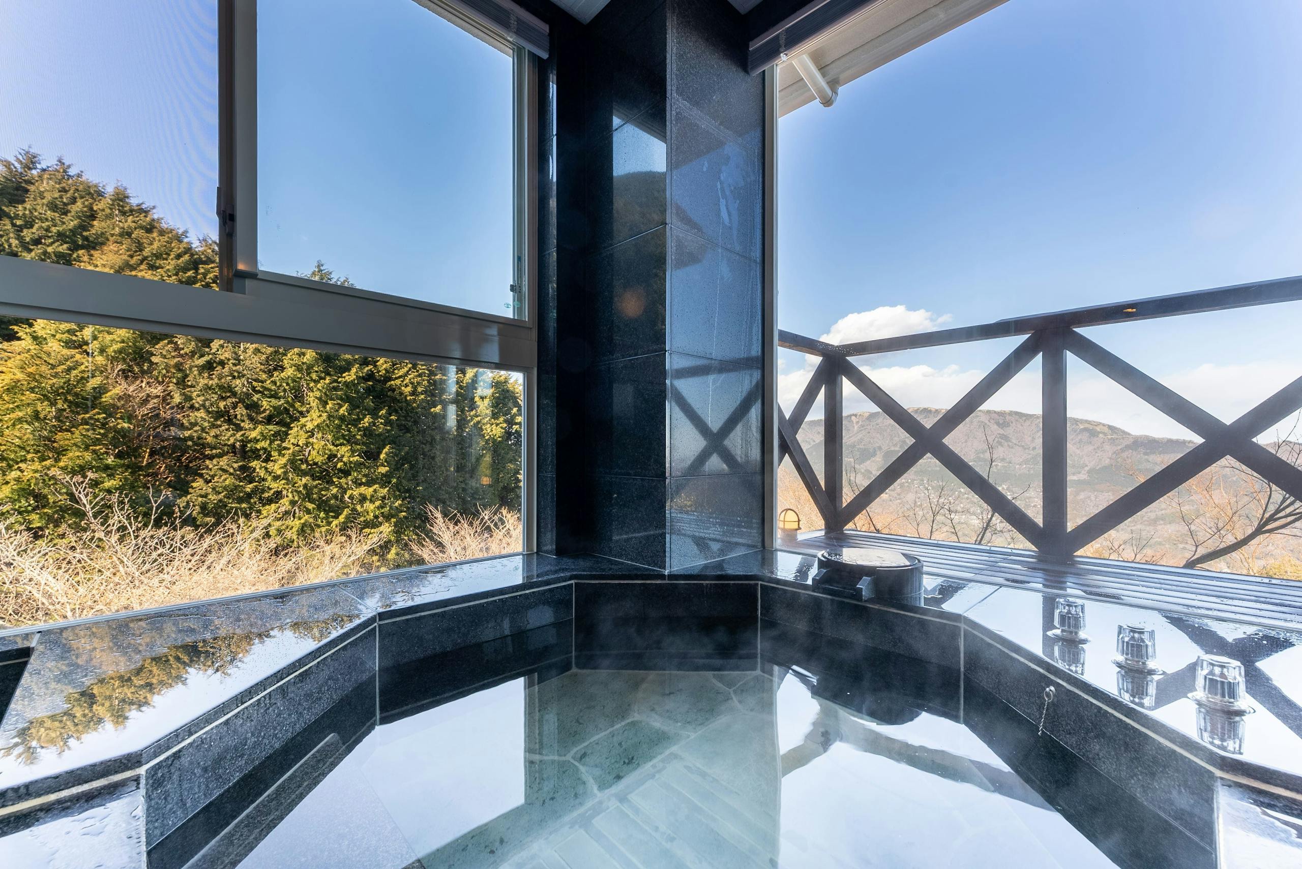 箱根別荘地の頂上という立地で眺望が抜群な「Noёl HAKONE GENSEN」では、美肌効果で知られる「二ノ平温泉」の100%源泉が楽しめます。